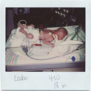 So at 1:30 p.m. June 27, 1998, they admitted me to surgery, my husband couldn't be in there with me because they put me to sleep. I woke up a couple hours later and the DR told me I had a son and he was doing fine, they took me to the Neonatal Intensive Care Unit so I could see him, I couldn't really see because my contacts were out and the nurses were giving me their glasses so I could so, he was so tiny but he was mine and he had such blond hair. He weighed 4lbs 10 0z when he was born, 18 in long---they were off by an ounce. We named him Luke Cameron.